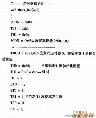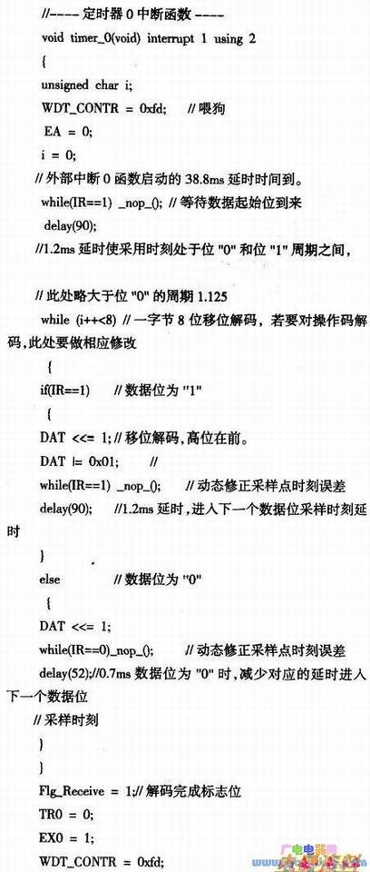 解码算法主要在定时器中实现,主要是靠1.125~1.69ms之间的粗略延时循环的判断采样点信号,根据采样信号为“O”、“1”动态修改进入下次采样的延时时间,使每次的粗略延时迅速得到修正,保证了解码的成功率。并且采用看门狗复位因干扰信号造成的死机。下图为数据位为“0”和“1”的采样时刻比较图,从中我们可以更清晰的理解程序原理。