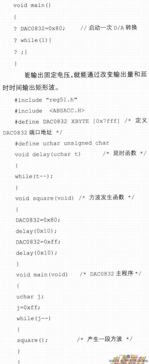 那么程序中所有出现DAC0832的地方,就是对地址为0x7FFF的1/0端口进行访问。这是一个输出固定的程序,我们定义一个转换接口地址,每向该地址写入一个数据,即可完成一次D/A转换。
