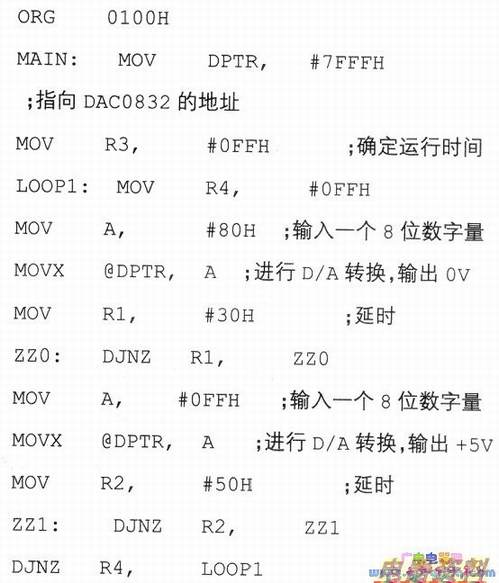 按照所画的电路图,CPU对DAC0832进行一次写操作,就是把一个8位数据写入DAC寄存器,随即发生转换,输出一个模拟量。这个动作只需要三条指令: