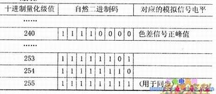 8位二进制码共有256个彼此不同的8位二进制码字,可分别分配给8bit精度的256个量化值。但考虑到可能有幅度超过正常范围的信号,以及有些码字还要留作它用等原因,相关标准规定,这256个码字并不都分给编码图像信号使用,它们与十进制表示的量化级及模拟图像信号电平的对应关系如下表所示。