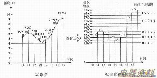 下图为模拟信号数字化示意图。其中,下图(a)为模拟信号取样过程示意图。取样的时间是t0、tl、t2……取得相应时刻模拟信号幅度的瞬时值是u0、ul、u2……并将该值保持到下一取样时刻。相邻取样间的历时,称为取样。每秒含有的取样周期数称为取样。经过取样,时间和幅度连续变化的模拟能成为时间离散、大小仍对应模拟信号相应时刻瞬时值的一系列取样值,或简称样值。下图假定模拟信号大小在0~10V变化,这些取样值也会是该范围内的任何值。