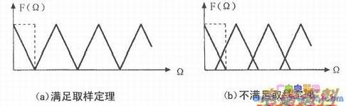 下图(b)为取样频率低于信号中最高频率成分2倍,不满足取样定理的示意图。表现到频谱分布上,将发生频谱混叠,终端不再能从中单独取出原始信号的频谱成分。