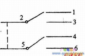 有一种转盘式的开关(见上图)转盘部分有10个齿,每个齿旁边标着“+”或“-”;下边有6个引出焊片分别标着1~6,这种开关看起来很复杂,其实就是一个双刀双掷开关。2和5焊片为刀,其余4个引出焊片为掷(见下图)。当转盘转到“+”时,2与3导通、5与6导通;当转盘转到“-”时,2与1导通、5与4导通。虽然转楹有十个齿,可以转10次,但只有上边说的“+”、“-”两种状态。