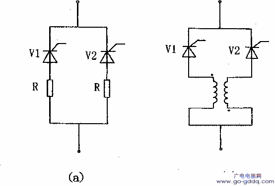 当单个晶闸管的通态平均不能满足需要时,可以采用两个以上同型号的晶闸管并联使用。由于管子特性不可能完全一致,在触发导通时,触发低的管子将先导通,导通后内阻小的管子将流过较大的电流,这样会导致管子过电流损坏,所以必须加均流措施。