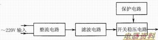 如下图所示是方框图。电路主要由、电路、开关稳压电路、保护电路组成。这一电路与前面几种电路主要不同之处是220V的交流市电没有经过降压电路,而是直接加到了整流电路中进行整流,在滤波电路之后又加了开关稳压电路和保护电路。另外,这种电源电路的具体电路相当复杂,电路变化也多,保护电路也很复杂。