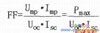 太阳能电池的填充因子又称曲线因子。系指太阳能电池最大功率与开路和短路乘积的比值,用符号FF表示。是评价太阳能电池输出特性好坏的一个重要参数,它的值越高,表明太阳能电池输出特性越趋近于矩形,电池的光电转换效率越高。它与太阳能电池开路电压、短路电流和电压、负载电流的关系式为: