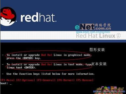 第二步:系统会自动进入到Linux安装初始画面,第一要选择安装的方式,其中如果要选择文本界面安装需要在引导命令处输入命令linux text,如果要选择图形界面安装的话直接安回车Enter。笔者使用的是图形安装。