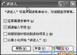 在“运行”中输入“narrator”后单击“确定”按钮,系统首先会弹出一条警告信息,不予理睬,直接单击“确定”后便请出了本文的主角──“讲述人”,它的设置界面如图所示。如果你的音箱已经打开,应该已经听到了语音(如果你不想听的话,就按一下l键)。再按任意键试试,你输入的字母键被系统用标准的美国英语读了出来,这时一个完全的语音键盘就诞生在你的手中了,有兴趣的朋友不妨试试。