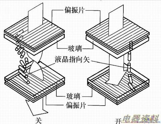 在TFT-LCD有源矩阵中,TFT透明电极矩阵制作在下玻璃板上,上玻璃板是滤光板,液晶材料夹在两块玻璃板之间,向列相液晶分子长轴在上、下玻璃板之间扭曲90°,玻璃板夹在两个偏振片之间,整个结构的功能如同一个电压控制的光澜。