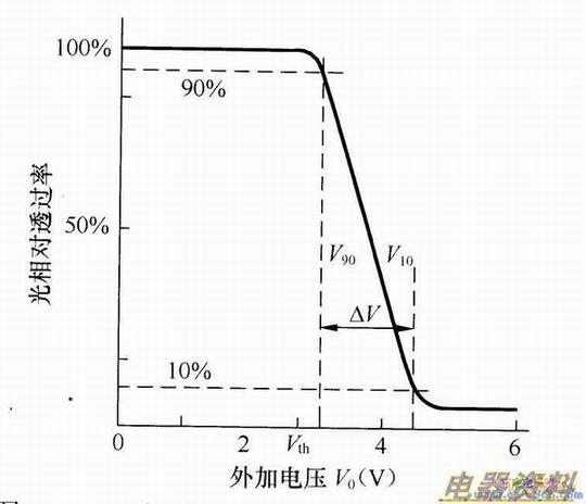 TN-LCD的上、下两个玻璃片的摩擦方向相差90°(正交),当自然光通过上偏振片后变成线性偏振光,并且偏振光的振劝方向与偏振片的偏振方向一致,同时也与上玻璃基片附近的液晶分子排列方向一致。当通过上偏振片的光进入液晶层后,由于液晶的折射率n0≠ne,线性偏振光分解成O光和E光夕其传播速度不同,但相同,因而在任一瞬间O光和E光合成的结果是使偏振光的振动方向发生了变化,通过液晶层的光也被逐渐扭曲了。曲于TN-LCD边界条件的限制,当光线到达下偏振片时,其光轴振动方向被扭曲了90°,与下偏振片的偏振方向一致,困而光线可以通过下偏振片而成为亮场。当施加后,液压分子在电场作用下取向,扭曲结构消失,通过上偏振片的线偏振光进入液晶层后不再旋转,因而不能通过下偏振片,形成暗场。这种显示方式的电光响应特性曲线如图4所示。