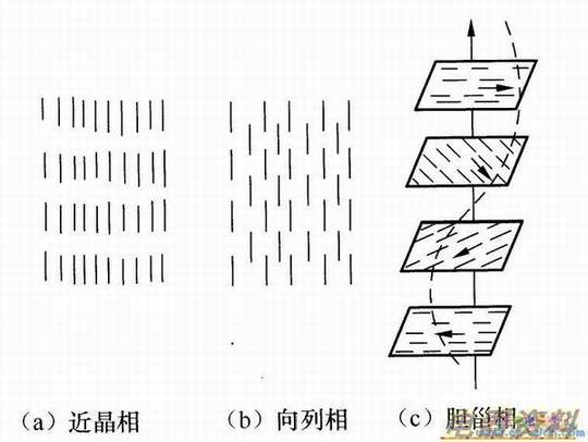根据液晶形成的条件和组成,液晶可以分为热致液晶和溶致液晶两大类,前者液晶相曲温度变化所致,后者则由符合一定结构要求的化合物与溶剂所组成。热致液晶又分为近晶相(Smect)、向列相( Nematic)和胆甾相(CholeSTeric ),如图1所示。
