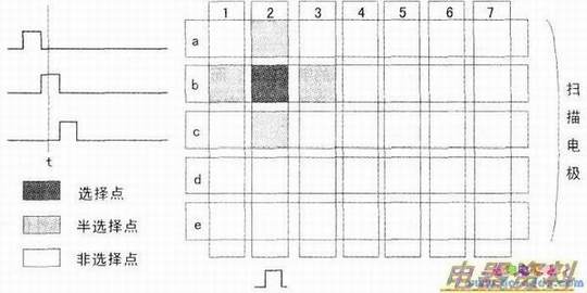 选择点的电压为V,半选择点的电压为:(1/a)V和[(a一2)/a]V,非选择点的电压为:一(1/a)V,可以保证非选择点的电压等于半选择点的电压,以实现提高对比度的目的。