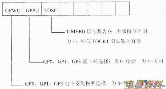 (2)OPTION参数定义寄存器。OPTION是一个8位的专用寄存器,其功能是用来定义芯片的工作参数,其特点与TRIS相似,对PIC12C5××,用户不能对OPTION寻址的(数据存储器图3上无OPTION的地址)。OPTION的内容也是由W的内容置入,其置入的指令为MOVLWB‘×××××××בOPTION