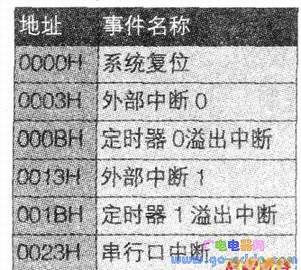 程序存储器的寻址空间为64KB,其中有7个单元具有特殊功能(中断入口地址).如下表所示。