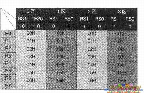 片内工作寄存器共有4x8=32个,这32个奇存器的地址编号为OOH到1FH,分成四个区,每区8个寄存器都用RO—R7来标称。当前使用到的工作寄存器区,可由PSW中的RS1、RSO位指示出来(见下表)。