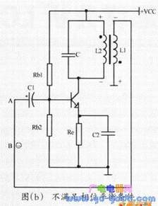 在图(a)中,Rb1和Rb2是两个上、下偏置,Re是发射极,只要它们的阻值大小合适,电路就能获得合适的静态工作点。其反馈元件为L1,由它给放大电路提供正反馈电压,可得知,电路满足振幅平衡条件。