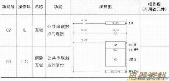 互锁指令IL(02)和解除互锁指令ILC(03)的操作码、名称、功能、梯形图、操作数见下表。