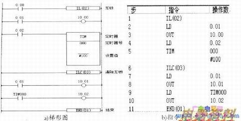 在下图中,当触点0.00闭合时,IL有效,若此时触点0,01、0.02闭合,则输出线圈10.00得电,定时器线圈TIMOOO得电,lOs后触点TIMOOO闭合,线圈10.02得电。当触点0.00断开时,IL指令无效,若此时,触点0.01、0.02闭合,线圈10,00、TIMOOO均无法得电,输出继电器10.00无输出,定时器TIMOOO也不计时,当然,线圈10.02在1Os后也不会得电。因线圈10.01在ILC指令之后,不受互锁指令IL的影响,当触点0.01闭合时,它仍然会得电。
