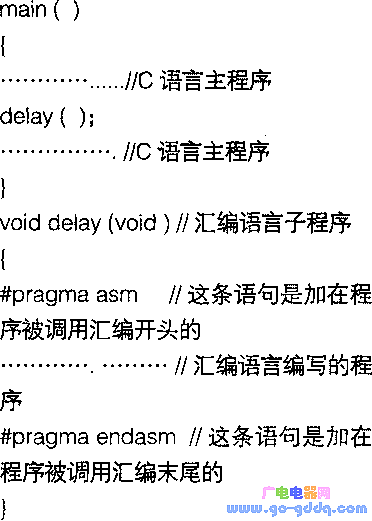 例:在主程序(C语言编写)中调用一个简单的汇编语言延时子程序。