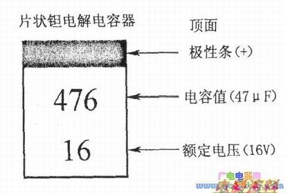 片状钽电解电容器的顶面有一条黑色线,是正极性标志。此外顶面上还有电容容量代码和耐压值,如下图所示。