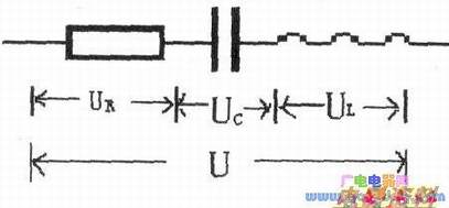 假定电阻、电容、三者串联(见上图),由电工学知识知道:流过电阻上与是同向的,即没有;而流过电容上的电流比电压超前90°(假定逆时钟时针为超前),流过电感线圈上电流比电压滞后90°,则它们就有如下图所示的矢量关系(假设电感线圈上UL大于电容两端电压U。),由下图可知:电路两端总电压