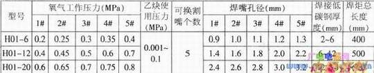 气焊炬结构功能及有关参数见附下图所示,基本参数见下表。工作原理是打开焊炬氧气阀门、乙炔阀门时,具有一定压力的氧气经导管进入喷嘴,并以高速喷入射吸管,使喷嘴周围空间形成真空,从而将乙炔管内乙炔吸入射吸管,经混合气管混合后,由焊嘴(割嘴)喷出,氧气和乙炔混合气体燃烧时产生的高温火焰用来融化焊丝和焊件。焊炬内乙炔的流动主要靠氧气的射吸作用,所以不论使用低压、中压乙炔均能使焊炬正常工作。