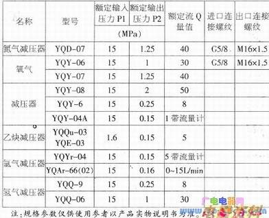 2,氧气表(气瓶减压器)、乙炔表(乙炔减压器)严禁被各种油脂沾染,检查进气口端和出气口端有无异物或灰尘,减压器规格参数见下表。
