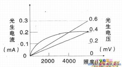 光电池在不同光强照度下可产生不同的光和,硅光电池的光照特性曲线如下图所示。从曲线可以看出,它的短路电流与光的照射强度成线性关系:而开路与光照度成非线笥关系,当光照强度达到一定程度时,其光电压趋于饱和。
