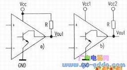 电压比较器有的使用单工作,如下左图所示。有的单和双电源都可以使用,如下中图。我们经常使用的四电压比较器LM339,既可使用最大值36V的单电源,也可使用±18V的双电源。电压比较器的输出端,有的自身可以输出高电平及低电平,例如输出级采用推挽式结构的;而有的电压比较器输出级是一只集电极开路的三极管,称作集电极开路输出,参见下右图,也有场效应管漏极开路输出型,与集电极开路输出型类似。对于集电极开路输出和漏极开路输出的电压比较器,使用时要连接R,输出端才可能有高电平,如右图所示。上拉R-端连接在比较器的输出端,另一端则有两种选择:一是连接在芯片自身的电源端V上,如右图a,二是连接至另一独立电源,如右图b中的Vcc2上。其中第二种连接方法可以用来改变传输电平,用低电平逻辑控制高电平逻辑,或者相反。