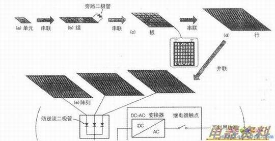 所有看似复杂的太阳电池阵列,都是由一个个单元串、并联,再加入附加电路组成的。如下图所示,先将单元串联成组,再把组串联成板,然后由板串联成行,最后由行并联成阵列。