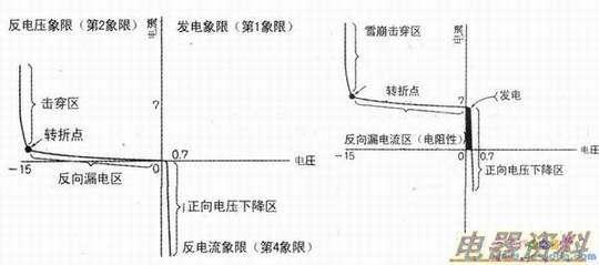 太阳电池的特性和二极管相似:加上正向电压,就会产生正向压降:加上反向电压,在转折点处就会产生雪崩。除发电的第一象限外,其余两个工作象限就是这种情形。