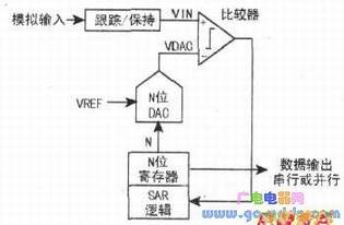 SAR的实现方法很多,但它的基本结构很简单,如下图所示。该结构将模拟输入电压(VIN)保存在一个跟踪/保持器中,N位寄存器被设置为中间值(即100…0,其中最高位被设置为1),执行查找算法。