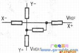 将它的一边接VREF,另一边接地。同时,将未偏置的那一层连接到一个ADC的高输入端。当触摸屏上的压力足够大,使两层之间发生接触时,电阻性表面被分隔为两个电阻。它们的阻值与触摸点到偏置边缘的距离成正比。触摸点与接地边之间的电阻相当于分压器中下面的那个电阻。因此,在未偏置层上测得的电压与触摸点到接地边之间的距离成正比。