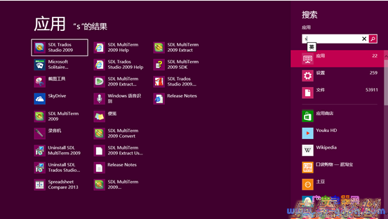 Windows 8 为我们提供了一个强大的搜索工具。仅仅通过在“开始”屏幕中简单的键入,我们可以便捷的搜索文件、应用、特定的设置。等等。如果某一应用有内置搜索功能,你也可以在该应用中直接调用超级按钮的搜索键来进行快速搜索。例如,如果你想搜索“小吃大排档”,Windows 8 的搜索功能将查找所有与大排档有关的应用和文件,但是,你也可以点击“必应搜索”进入该应用体验其带来的搜索功能。
