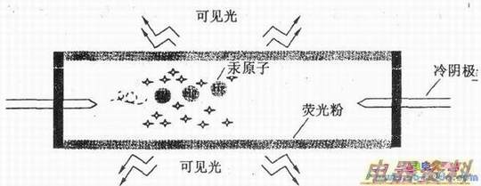 FL是一个密闭的气体放电管,其结构如下图所示。在灯管的两端是阴冷极,采用镍、钽和锆等金属做成,无须加热即可发射电子。灯管内主要是惰性气体氩气,另外,有充入少量的氖气和氪气作为放电的触媒,再有就是少量的汞气。在两端加一定高压(这个为启动电压,一般为1500~1800V)时,灯管中的汞原子在高压的作用下会释放出紫外光,波长大约是253.7nm。与此同时,有一部分电能转化为热能白白消耗掉了,大约只有60%电能会转化成紫外光。灯管的内壁涂有一层薄薄的白色荧光粉(假定这个灯管是白色的),这层荧光粉在吸收到灯管内的紫外光后,会发出可见光,这时就看到灯管亮起来了。这个点亮的过程很短,一般为1~2s。灯管被点亮后,由于内部气体性质发生了变化,此时只需要比启动电压低很多的一个小电压(这个电压为维持电压,一般为500~800V)就可以维持灯管继续点亮,而且亮度不会发生变化。冷阴极荧光灯是一个非线性,灯管的供电必须是交流正弦波,为40~80k。