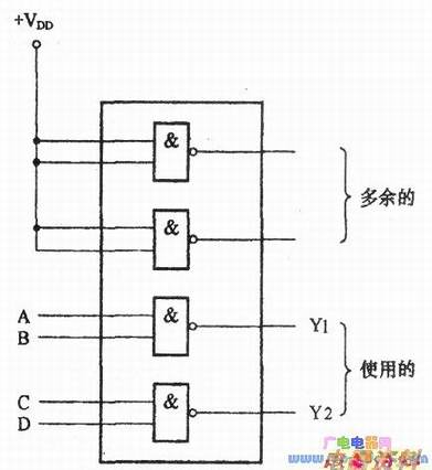 ①有些数字集成电路内部包含有若干个互相独立的门电路或,对于其中多余不用的门电路或触发器,往往将它们的输入端接正电源,如下图所示。