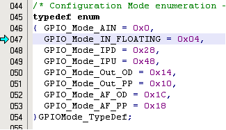 第1行和第3行完全是照抄,第2行那个GPIO_Mode_IN_FLOATING是在stm32f10x_gpio.h中找到的。