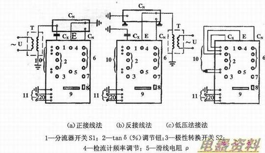 下图(a)为正接线法,用于两极对地的被试品;下图(b)为反接线法,适用于一极对地的被试品;下图(c)为低压法接线,主要用于测量被试物的值。