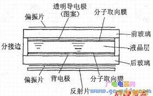如下图所示。将两片附有光刻透明导电极的玻璃相对放置在一起,其间相距约10μm。透明电极表面附有分子取向膜。四周有环氧胶密封边,密封边一侧留有一个开口,液晶材料在真空条件下注入两玻璃板之间的盒腔内,在液晶盒前后玻璃板上贴上偏振片即可形成。