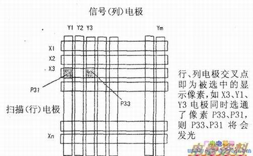 在液晶显示器上每一个显示像素都由其所在的列与行的位置唯一确定。如下图所示是无源矩阵电极驱动的寻址方式。图中行、列寻址线X3、Yl、Y3同时选通了像素P31、P33,此时像素P31、P33将发光,直至下次被寻址刷新(可能继续发光或不发光)。每秒刷新次数很高,所以可得到稳定的图像显示。