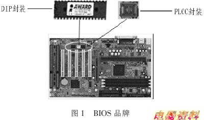 目前BIOS 品牌只有两种,即Award tware INC 生产的AWARD BIOS 和Ameri Mega trends INC 生产的AMIBIOS。另外还有Phoenix BIOS 该品牌已归于Award BIOS.外观上看有两种如图1 所示,一种是长方形两排针脚称 封装,容量有1 MB 和2 MB 两类多用于主板,大型界面卡上。另一种是正方形四边都有针脚称为 封装容量为2 MB 和4 MB 两类,多用于笔记本电脑,数据机较小型界面卡。