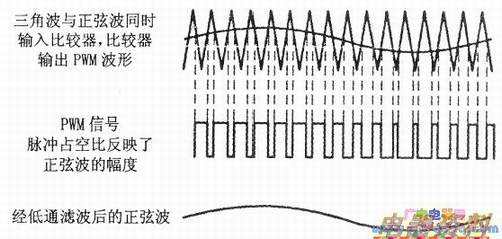 通过与一个高频三角波或锯齿波比较,可以很容易地将模拟输入转换为PWM信号,PWM信号波形放大后,通过低通产生平滑的正弦波输出,如下图所示。