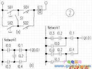 设计图2所示的例子,阐述梯形图编程的语法规则。使用移植法可直接由继电器控制原电路图2(a)得到移植程序图2(h),但图2(b)是不合法规则的“准梯图形”,需要将此修改成符合语珐规则的梯形图,即图2(c)。