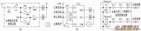 如图3(a)所示三相异步电动机的正反转继电器控制,是学生最熟悉的控制实例。对照图3(a)设计正反转PLC控制的梯形图,我们重点说明以下三个问题。