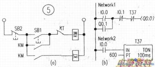 在继电器控制系统中,有许多控制是使用时间继电器按照时间原则进行控制的,当’用PLC取代这样的控制系统时.需要使用定时器指令。定时器包含三条指令,对初学者只需掌握与通电延时的时间继电器对应的接通延时定时器指令。设计图5(a)所示控制电路,并将其移植成PLC的梯形图,如图5(b)所示,在该例子中,阐明定时器位的作用及寻址方式后,学生将容易理解定时器指令的使用方法。