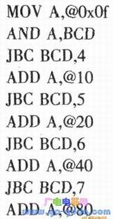 对于程序二的结果如仍然不满意,似乎稍嫌复杂,虽然速度有所改善,但在内存的分配上仍有余地,可以再改善成程序三的型态。转换过程只花费10个指令CYCLE,而且只需要一个变量空间,执行之后也不会改变原来BCD的内容。