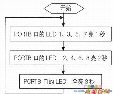 利用P16F84A的PORTB端口外接的8只,采用四种C程序控制端口的LED灯,来说明编辑C语言程序时的基本格式及其灵活性。程序流程如下图所示,采用的是无限循环工作方式。