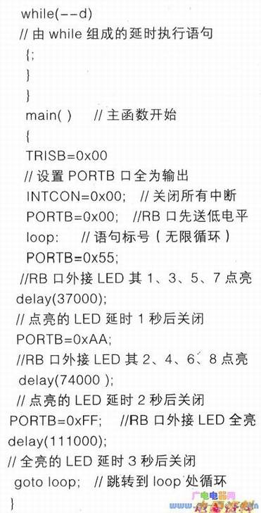 c.LED灯点亮时的无限循环,由goto无条件转移执行语句完成。其中loop为语句标号。对goto语句使用时应慎重,在简单的C程序中使用goto语句是必要的,但编辑复杂的C程序结构,会使程序的可读性变差。