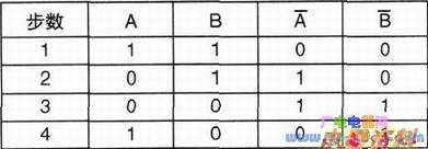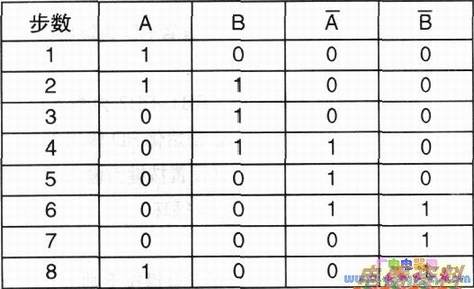 2相励磁时,每次对两相同时通电,磁场旋转一周需要换相4次,转子转动一个齿距角。在双三拍工作方式中,步进电动机正转的通电顺序为:AB→A的反B→AB的反→B的反A;反转的通电顺序为: