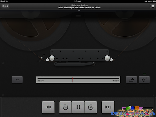 同样是在今年十月底,苹果公司发生了一次高层人事地震,拟物化界面设计的推动者 Scott Forstall 离职,工业设计大师 Jony Ive 统一管理软件和硬件设计。在 Scott Forstall 离开之前,苹果在与 iTunes 相关的软件界面上的拟物化已经达到了“级复刻”的程度,音乐播放时音量旋钮上随着机身晃动而变幻的光泽为人津津乐道,最新的 iOS 版 Podcast 应用甚至要在播放界面上复刻卷动老式磁带的效果: